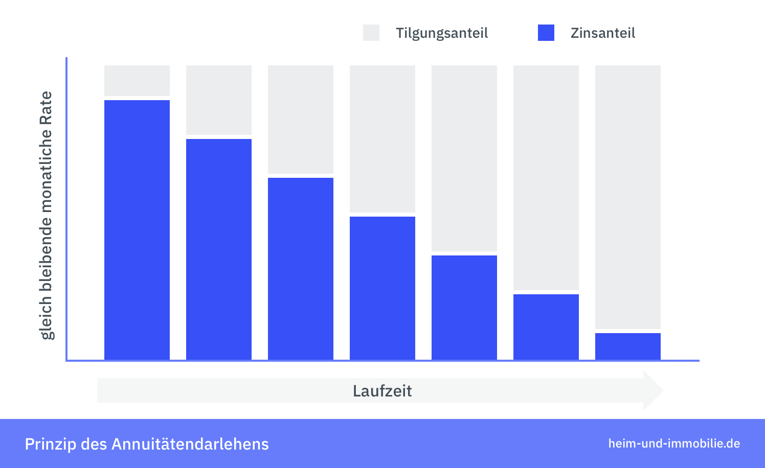 Die Annuität ist eine regelmäßig jährliche Zahlung über einen festgelegten Zeitraum, welche sich aus einem Tilgungs- und einem Zinsanteil zusammensetzt, um eine Darlehensschuld abzuzahlen. Das in einer Immobilienfinanzierung meist in Anspruch genommene konstante Annuitätendarlehen kann in monatlichen, viertel-, halb- und jährlichen Raten bedient werden. Der Vorteil eines konstanten Annuitätendarlehens liegt dabei in den über die Vertragslaufzeit hinweg gleichbleibenden Raten. Nach jeder Ratenzahlung wird durch die geringer werdende Restschuld innerhalb der vereinbarten Rate (Annuität) der Zinsanteil geringer, während sich der Tilgungsanteil erhöht.