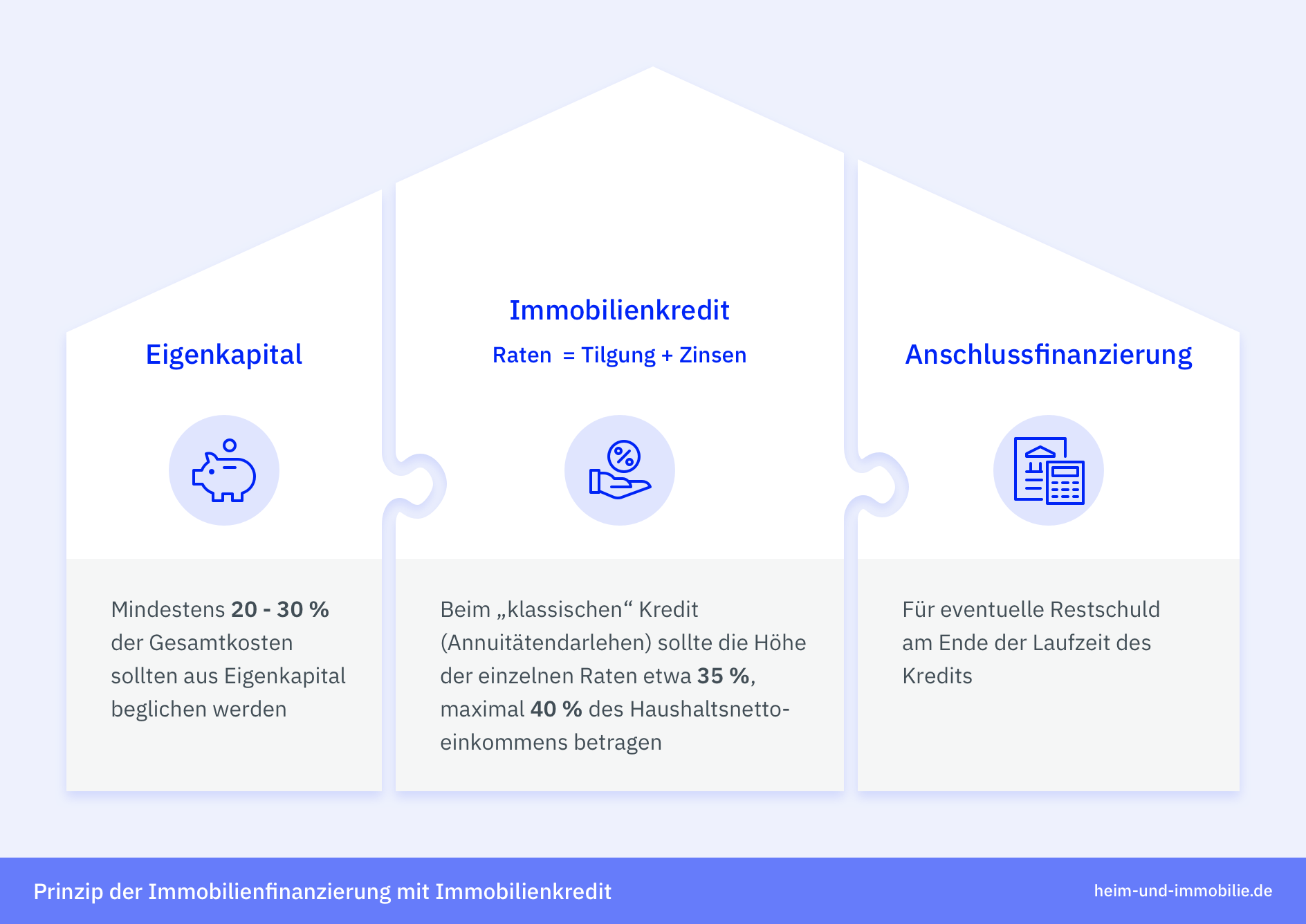 Bei einem Immobilienkredit handelt es sich meistens um ein Annuitätendarlehen. Das bedeutet, Sie zahlen im vereinbarten Zeitraum die Summe in gleichbleibenden Raten (Annuität) zurück, für gewöhnlich in monatlicher Zahlung. Durch die regelmäßige Tilgung reduziert sich mit der Zeit Ihre Darlehenssumme. Infolgedessen verringert sich der Zinsanteil der monatlichen Rate, und der Tilgungssatz bzw. Tilgungsanteil steigt. Bleibt am Ende des Immobilienkredits noch eine Restschuld vorhanden, können Sie diese entweder mittels Eigenkapital oder einer Anschlussfinanzierung tilgen.